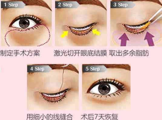 【作用与原理:】沿着下眼缘切开后,即将脂肪重置后把肌肉和皮肤进行锁紧提升,去除多余组织,缝合后固定。