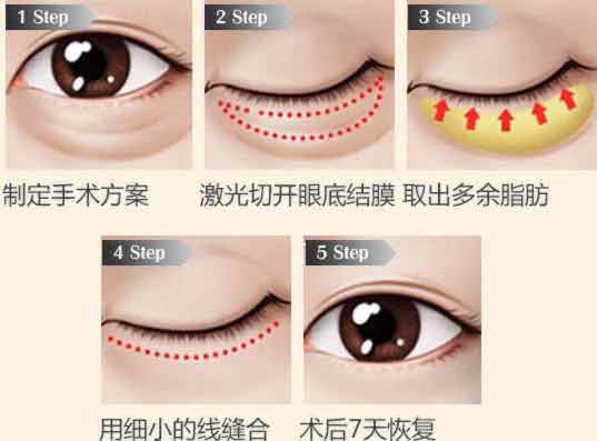 【作用与原理:】在下眼睑的内部做切口,将下眼睑多余的脂肪适度的去除,是一种直接有效的祛眼袋方式。